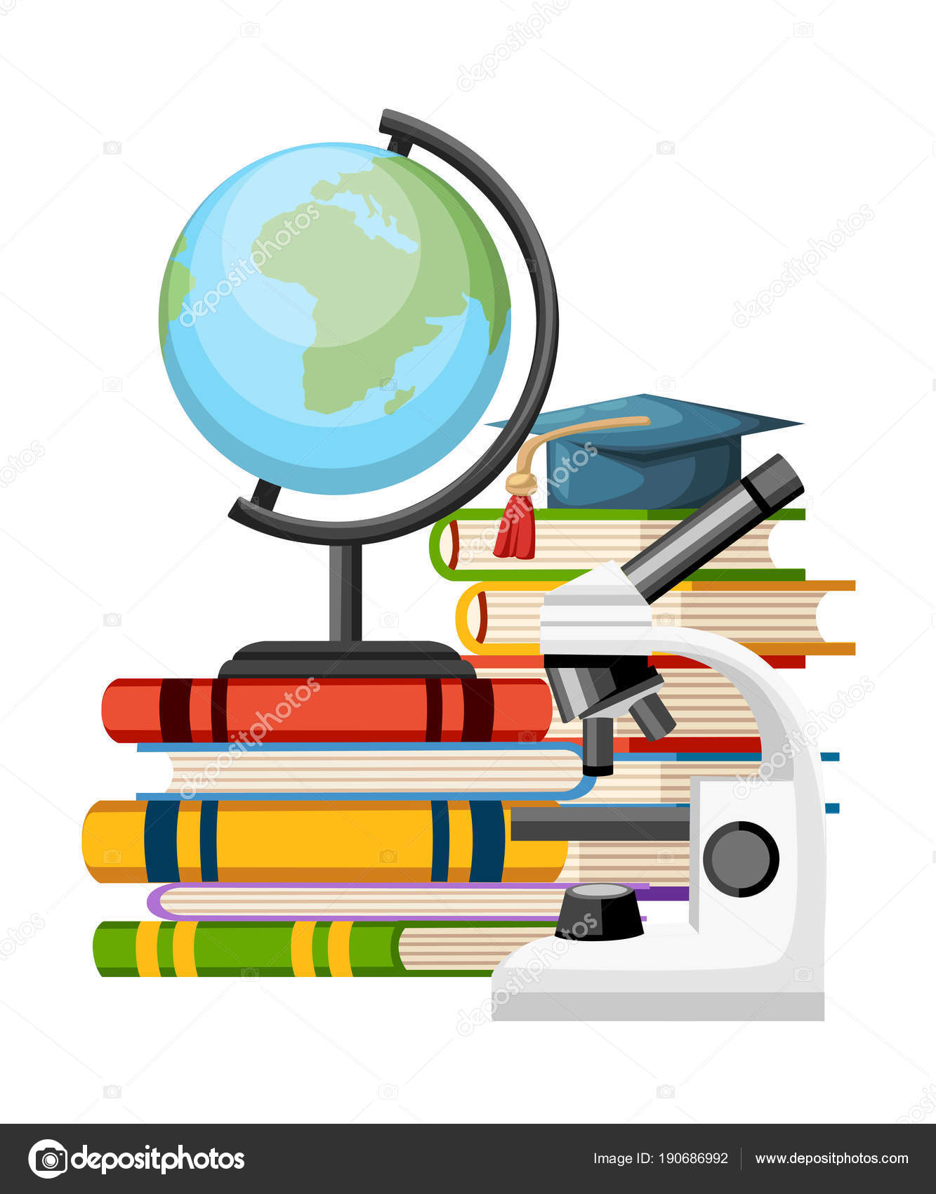 Microscope and globe on the books. Study concept for schools, colleges and universities. Cartoon style design. Vector illustration on white background.